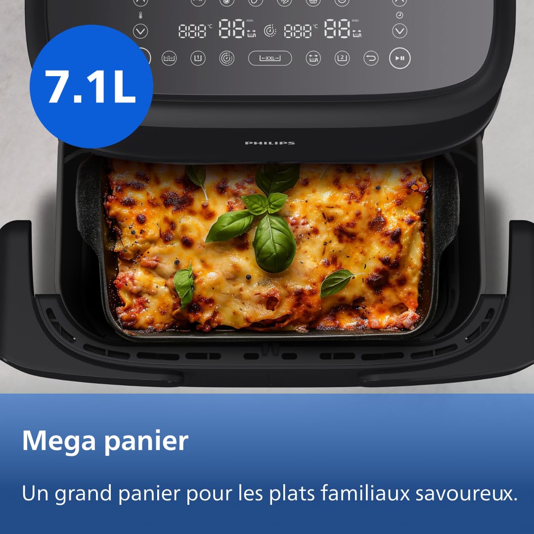 - CUISEZ DES REPAS FAMILIAUX EN UNE SEULE FOIS : Avec sa capacité de 7.1L, l’Airfryer Philips à double panier et séparateur amovible permet de préparer plusieurs plats à la fois, rapidement et facilement, pour des repas sains en famille ou entre amis.