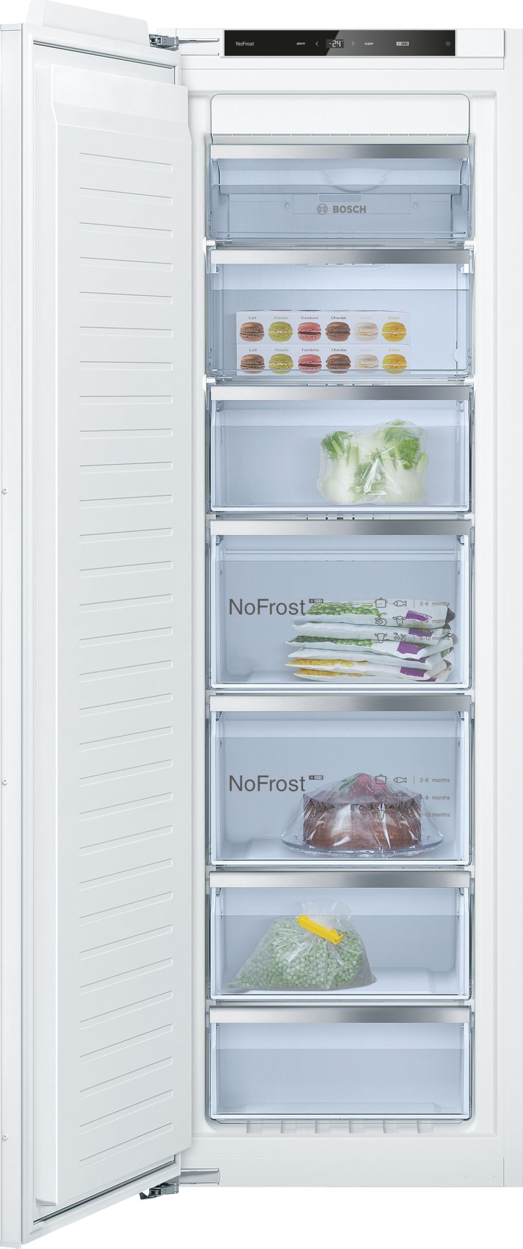 Flexibilité totale avec Vario Zone. Transformez l’espace intérieur de votre armoire congélateur selon vos besoins. Les tablettes en verre de sécurité sont amovibles, permettant de stocker des aliments volumineux comme une dinde entière ou plusieurs pizzas empilées. Idéal pour les grands repas ou les soirées entre amis, ce congélateur armoire bosch s’adapte à vos envies.